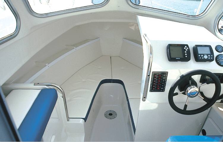 Accomodation Enclosed cabin, helmsmens seat with stowage under, fire extinguisher stowage and steering console to starboard, co pilot sitting area with cushion and stowage under. Portable single burner gas stove.Sink with electric pump and portable water carrier Berths and sitting area forward. Area forward of steering console to take optional toilet.